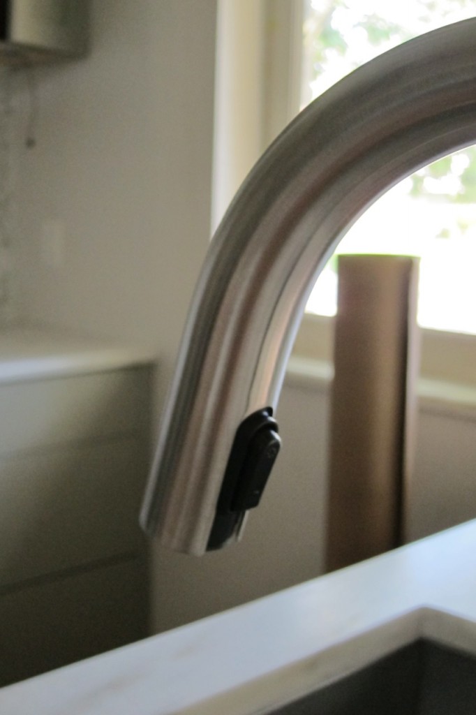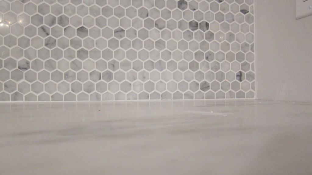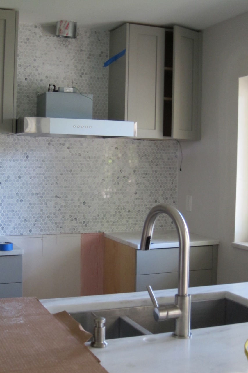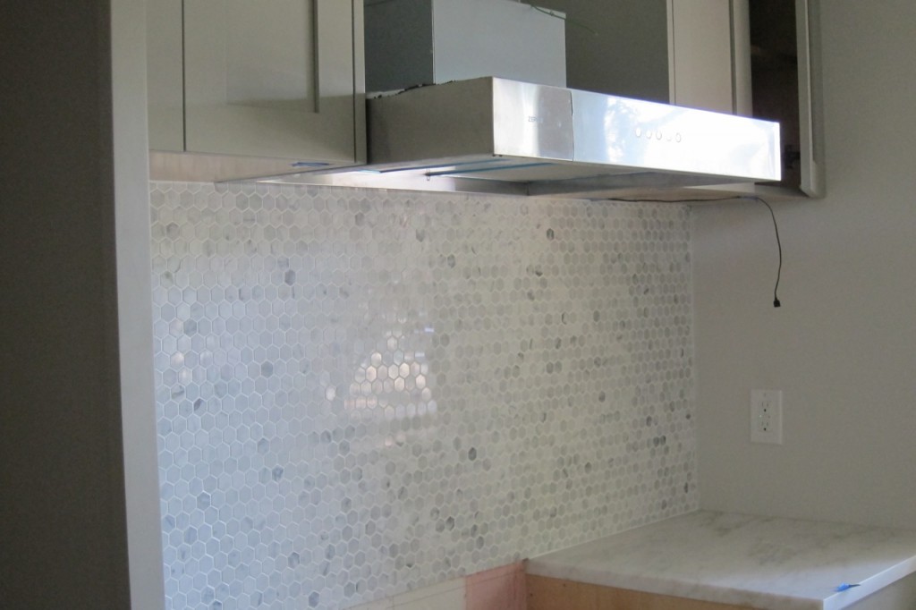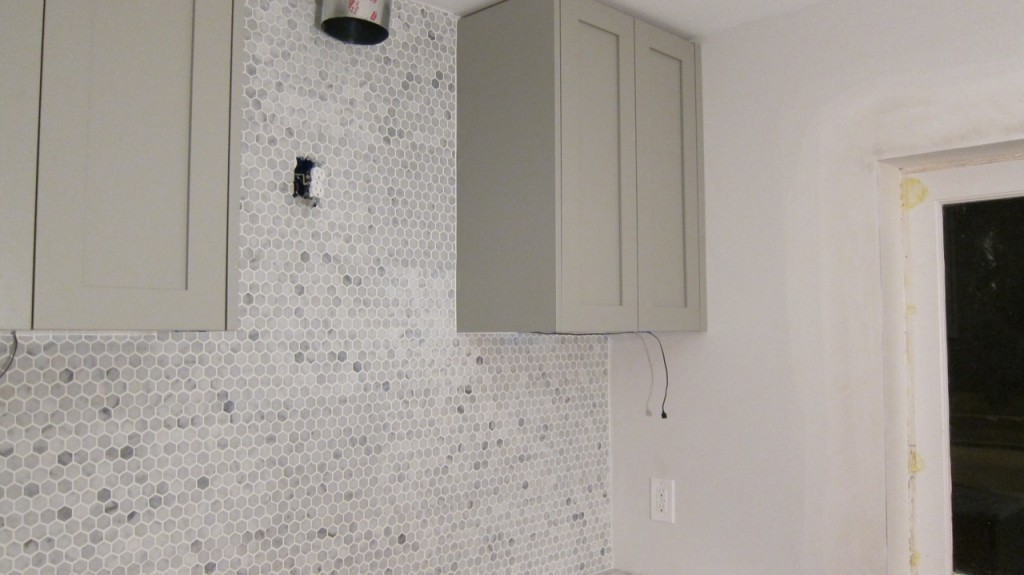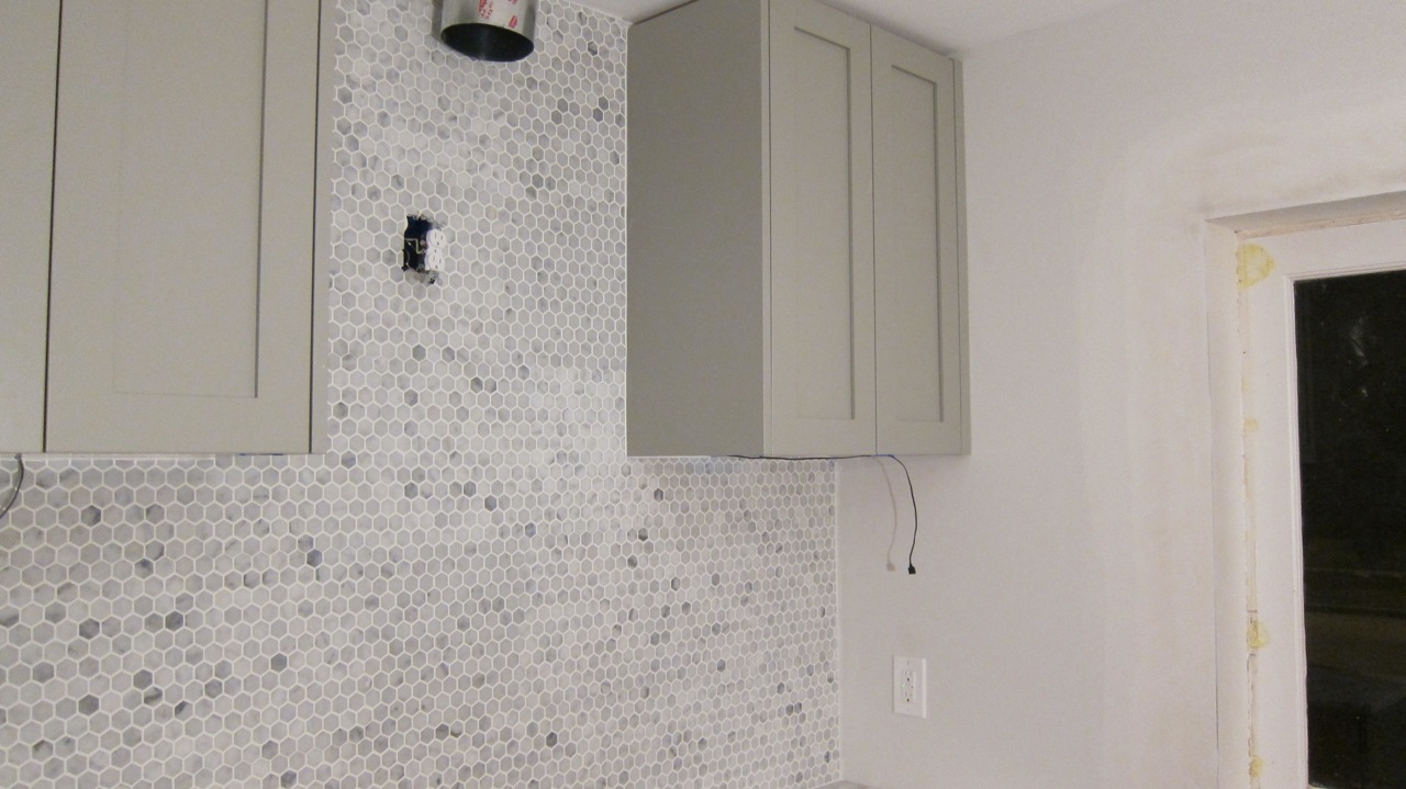 Not quite what I was expecting since I thought the hood would be installed in its entirety- not partially. Not to mention we still don’t have electricity in the kitchen. That was also scheduled today. And, I can’t quite figure if anything else was done other than the half-hazzard installation. At least the backsplash is fully placed and it looks good. 1″ polished Carrera hexagon tile with bright white grout.